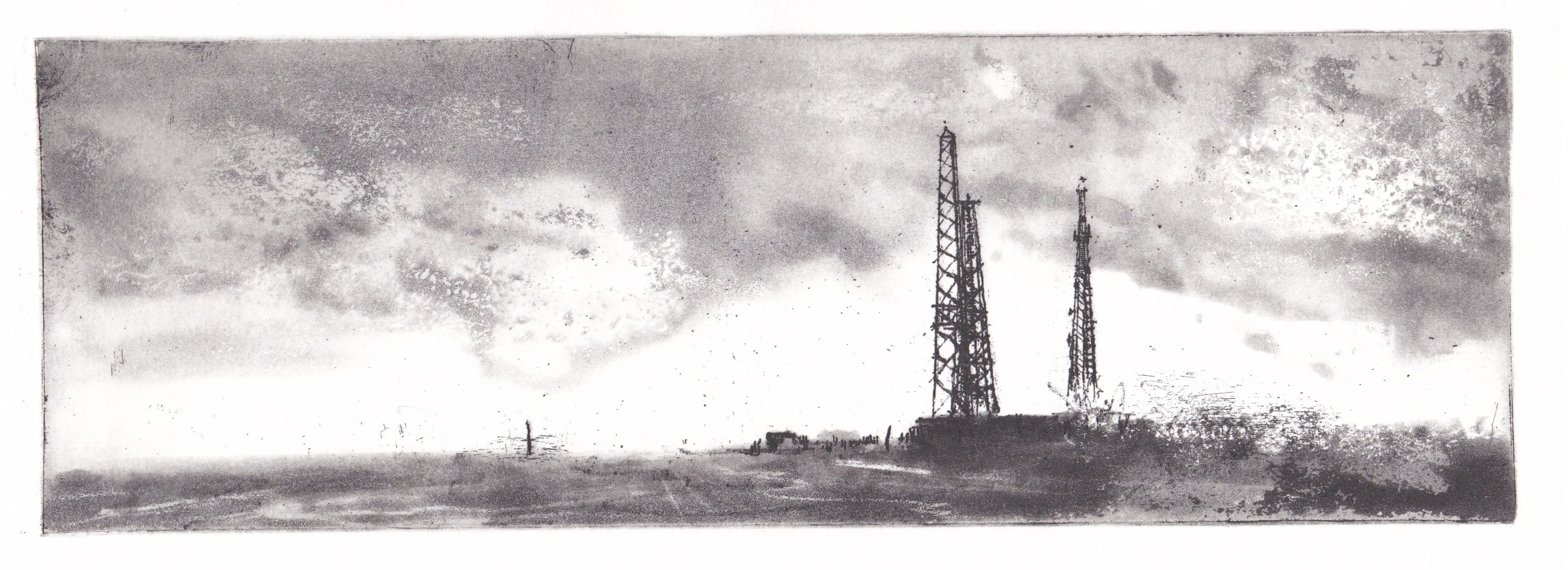 The Cleeve Common project incorporates several different sets of work made around the same area of land, a Common peice of grazing land on the edge of the Coteswold ridge outside Cheltenham, an historic site of ancient settlements, post industrial quarry, airfield and now site of radio transmitters. The project cmprises of a set of etchings that take a contemporary approach to landscape and attempt to evoke the sense of rediscovering its lost layers of history and lore. The prints are fragmented through stencilling and multiple layers that suggest something transitory, similar to what I feel when recalling – but not being able to clearly see – places in my mind.