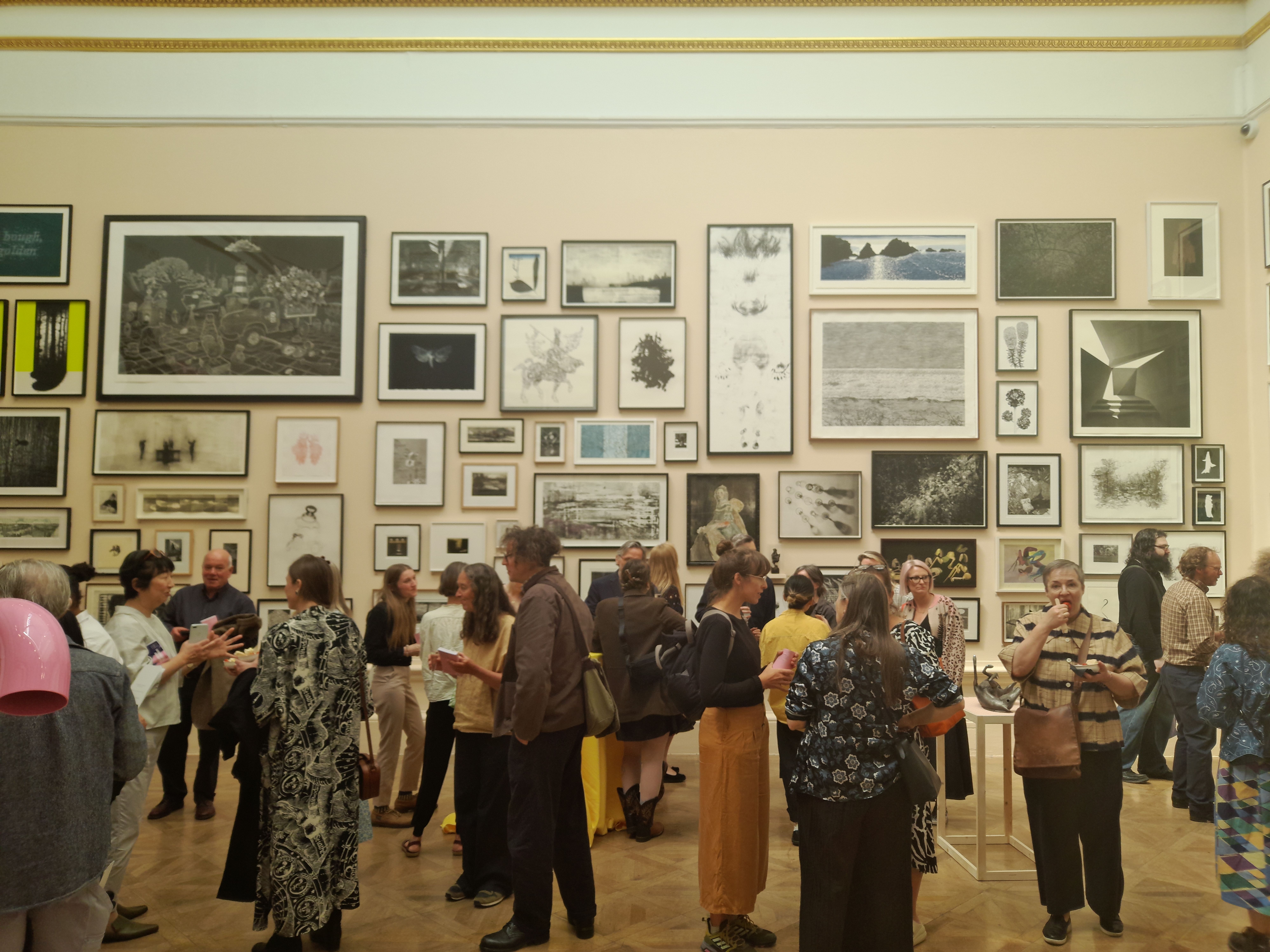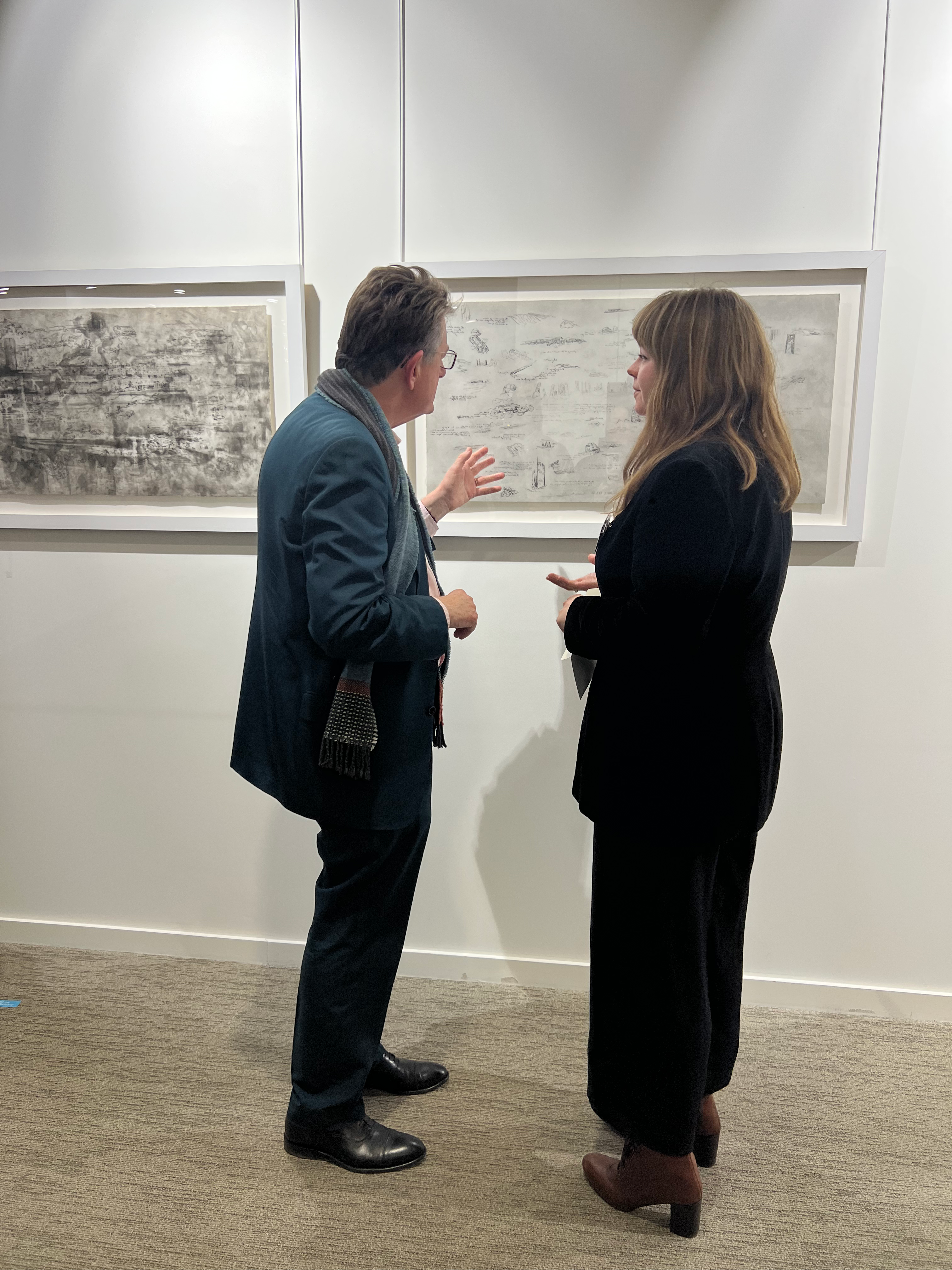 Evangeline Morris with Stephen Coppel at the private view of the Postgraduate Print in London 2022, stood in from of Evangeline Morris’ “Point of Exchange I”.