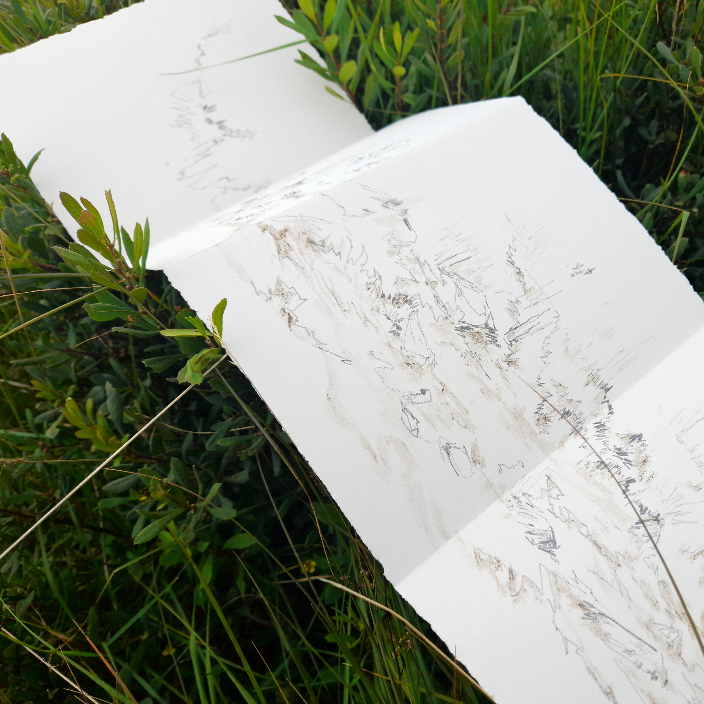Above: Image of on-site work for this commission. Concertina drawing resting on a Bog Mertyl Bush.